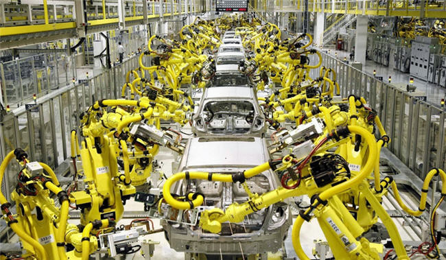 D) Robotización de los medios de producción: que consiste en crear un trabajo o un proceso mediante robots. Por ejemplo para fabricar coches como se puede observar en la imagen.